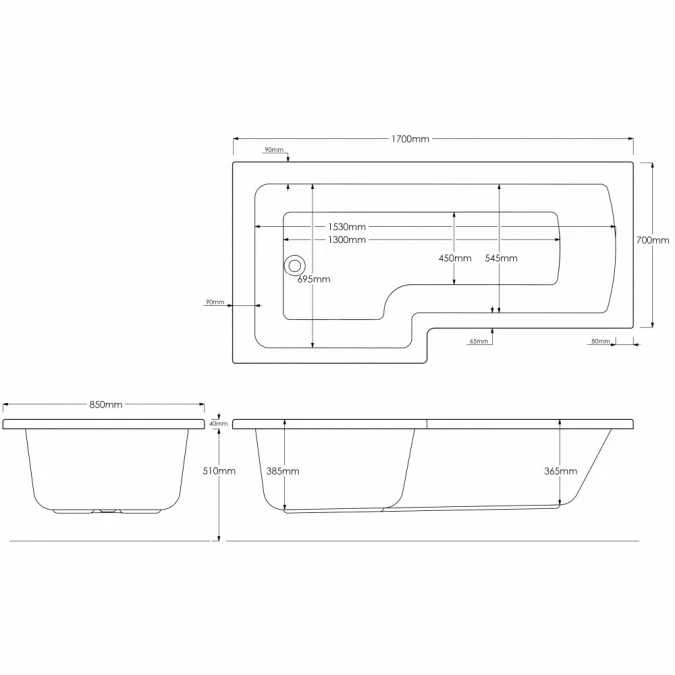 Sommer Square Shower Bath – 1700mm x 850/700mm – Left Hand